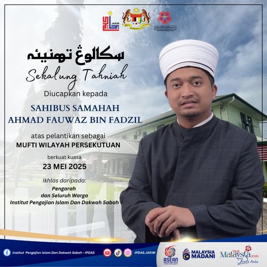 Pengarah dan Seluruh Warga Institut Pengajian Islam dan Dakwah Sabah (IPDAS) merakamkan setinggi-tinggi ucapan tahniah kepada Sahibus Samahah Ahmad Fauwaz bin Fadzil atas pelantikan sebagai Mufti Wilayah Persekutuan berkuat kuasa mulai 23 Mei 2025.