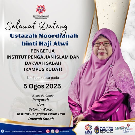 Sekalung Tahniah dan Selamat Datang diucapkan kepada Ustazah Noordianah binti Haji Alwi, Pengetua Institut Pengajian Islam Dan Dakwah Sabah (IPDAS) Kampus Kudat berkuat kuasa pada 05 Ogos 2025.