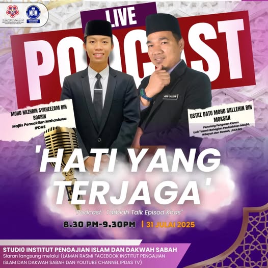 Institut Pengajian Islam dan Dakwah Sabah (IPDAS) melalui Cawangan Pembangunan Kecemerlangan Mahasiswa dengan kerjasama Majlis Perwakilan Mahasiswa IPDAS akan mengadakan Podcast : Tarbiah Talk Episod Khas sempena Bulan Manhaj Tarbiah seperti ketetapan berikut :