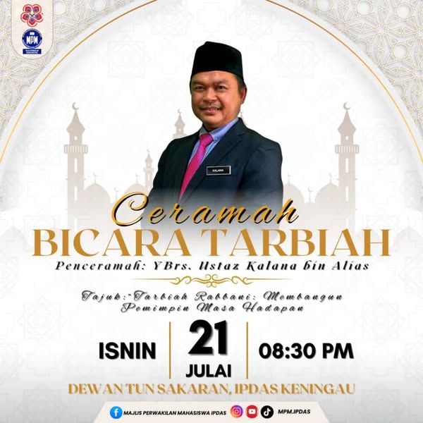 Institut Pengajian Islam dan Dakwah Sabah (IPDAS) melalui Cawangan Pembangunan Kecemerlangan Mahasiswa dengan kerjasama Majlis Perwakilan Mahasiswa IPDAS akan mengadakan Ceramah Bicara Tarbiah sempena Bulan Manhaj Tarbiah seperti ketetapan berikut :