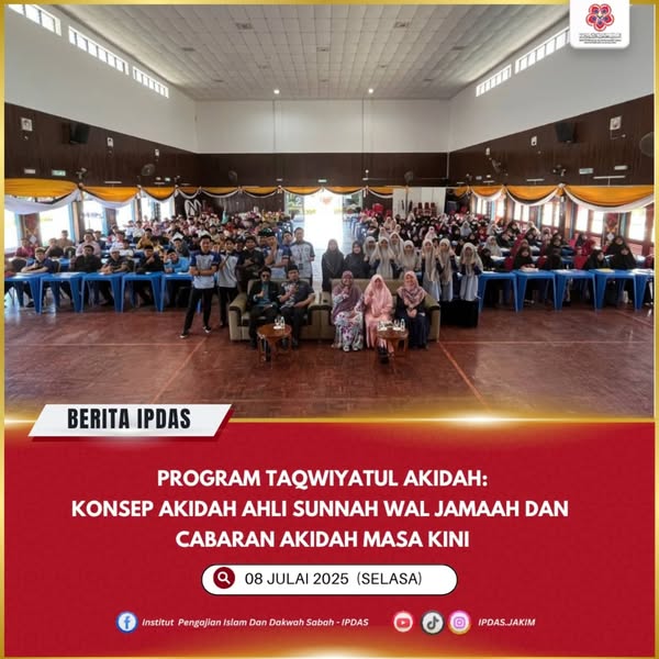Keningau - Institut Pengajian Islam dan Dakwah Sabah (IPDAS) melalui Jabatan Akidah Cawangan Akademik telah menganjurkan Taqwiyatul Akidah : Konsep Akidah Ahli Sunnah Wal Jamaah dan Cabaran Akidah Masa Kini yang melibatkan para mahasiswa IPDAS Semster 1 Diploma Dakwah Islamiah dan Diploma Dakwah Kontemporari serta semester 2 Sijil Pengajian Islam, bertempat di Dewan Tun Sakaran pada 5 Julai 2025.