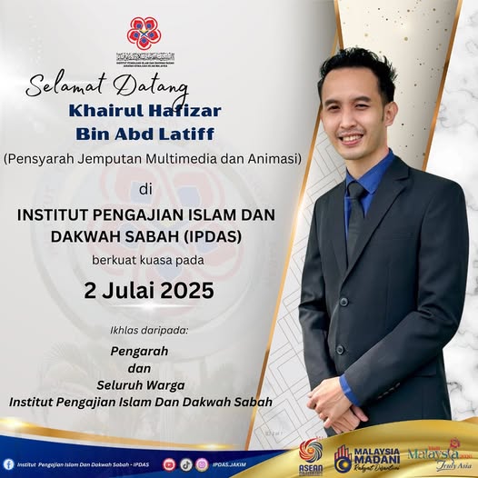 Sekalung Tahniah dan Selamat Datang diucapkan kepada Khairul Hafizar Bin Abd Latiff (Pensyarah Jemputan Multimedia dan Animasi), di Institut Pengajian Islam Dan Dakwah Sabah Kampus Keningau.