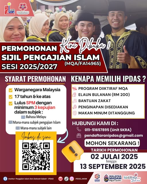Institut Pengajian Islam dan Dakwah Sabah (IPDAS) mempelawa calon yang berminat untuk mengisi permohonan melalui pautan berikut :
