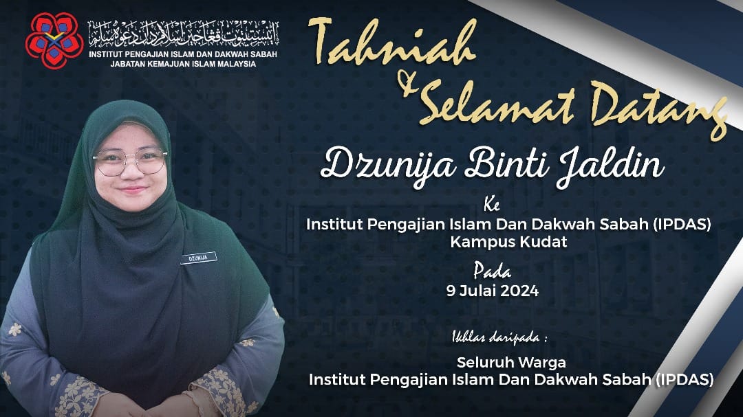 Ucapan sekalung tahniah kepada Cik Dzunija binti Jaldin, atas perlantikan sebagai pensyarah kursus Bahasa Melayu yang baharu di IPDAS Kampus Kudat, berkuatkuasa pada 9 Julai 2024.