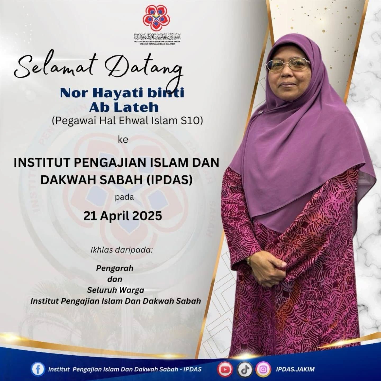 Sekalung Tahniah dan Selamat Datang diucapkan kepada YBrs. Puan Nor Hayati binti Ab Lateh (Pegawai Hal Ehwal Islam S10) ke Institut Pengajian Islam Dan Dakwah Sabah.