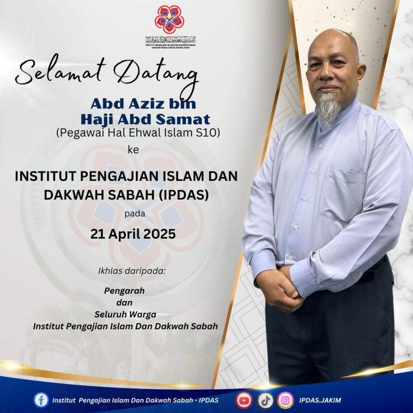 Sekalung Tahniah dan Selamat Datang diucapkan kepada YBrs. Encik Abd Aziz bin Haji Abd Samat (Pegawai Hal Ehwal Islam S10) ke Institut Pengajian Islam Dan Dakwah Sabah.