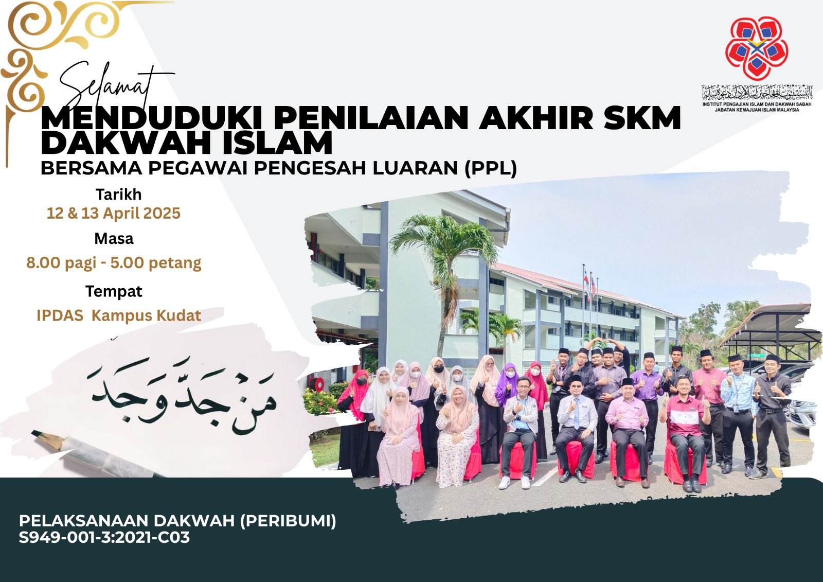 Selamat Menduduki Penilaian Akhir SKM Dakwah Islam Tahap 3 Bersama Pegawai Pengesah Luaran (PPL) kepada semua Perantis SKM IPDAS Kampus Kudat pada 12 hingga 13 April 2025.