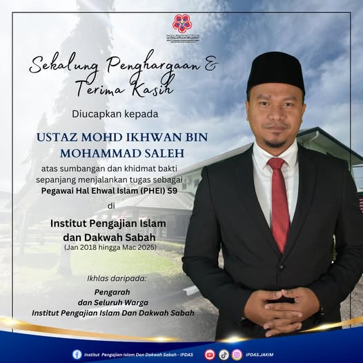 Sekalung Tahniah diucapkan kepada Ustaz Mohd Ikhwan bin Mohammad Saleh di atas pertukaran ke Jabatan Agama Islam Selangor (JAIS) berkuat kuasa pada 7 April 2025.