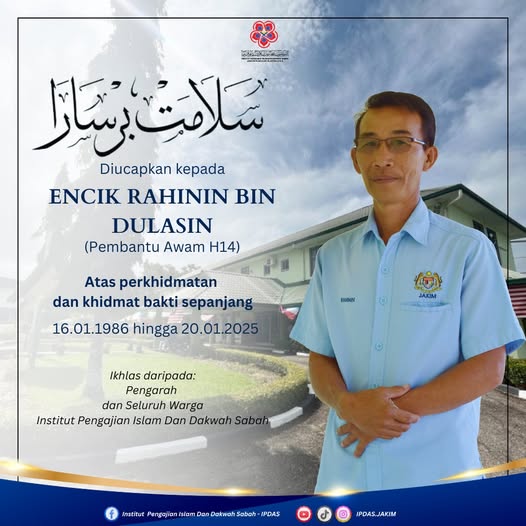 Selamat bersara En. Rahinin bin Dulasin, Pembantu Awam di Institut Pengajian Islam dan Dakwah Sabah yang bersara wajib pada 20 Januari 2025.