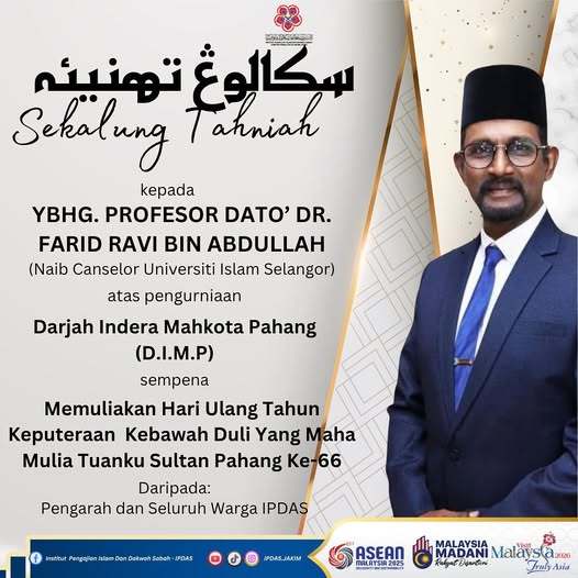 Setinggi-tinggi ucapan tahniah dan setulus penghargaan kepada YBhg. Profesor Dato’ Dr. Farid Ravi bin Abdullah, Naib Canselor Universiti Islam Selangor (UIS), atas pengurniaan Darjah Indera Mahkota Pahang (D.I.M.P) sempena Memuliakan Hari Ulang Tahun Keputeraan Kebawah Duli Yang Maha Mulia Tuanku Sultan Pahang yang ke-66.